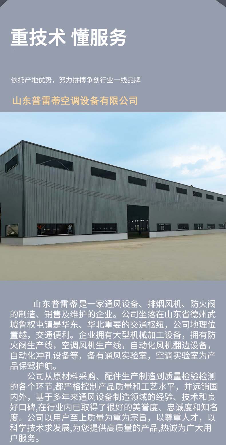 山東片多多空調設備有限公司是一家專業生產“排煙風機,防火閥”係列風機盤管(guǎn)、排煙防火(huǒ)閥、卡式風機盤(pán)管、風(fēng)冷冷熱(rè)水(shuǐ)機組、吊頂式空調機組、通風排煙設備及風係統配件產品的大(dà)型中央空調企業。他們的網站為消費者提(tí)供了消防排煙風機的產(chǎn)品詳細介紹頁麵,包含了消防排煙風機產品的圖(tú)片、價格、報價、型號、產地及供應商聯係方式等信息。